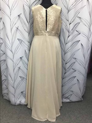 Odessa is a size 22 special occasion dress in a lovely champagne colour. the top is sequined and the straps are wide enough to wear a bra inder it although she does have built in shaping and bust cups. The skirt is chiffon over satin and the back fastens with a zip
