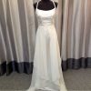 Opal is a satin 2-piece wedding dress in Ivory with a pale gold beaded and embroidered corset bodice and the same detail around the bottom of the skirt.